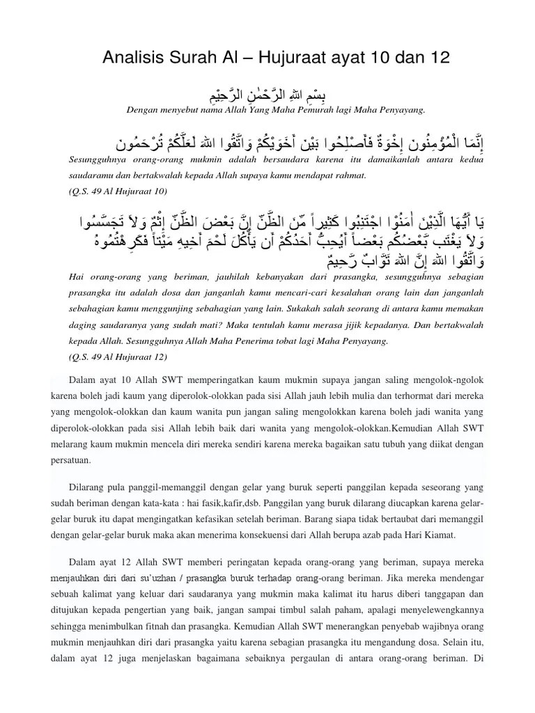 Contoh Soal Tentang Surat Al Hujurat Ayat 10 Dan 12 : Arti Perkata Surat Al Hujurat Ayat 10 13 Beinyu Com - Surat al hujurat ayat 10 adalah salah satu ayat tentang persaudaraan.. يٰۤاَيُّهَا الَّذِيْنَ اٰمَنُوا اجْتَنِبُوْا كَثِيْرًا مِّنَ الظَّنِّ. Surat al hujurat ayat 10 adalah salah satu ayat tentang persaudaraan. Al quran surat al hujurat ayat 12 menjelaskan keuntungan menghindari prasangka, serta kerugian jika meneruskan dugaan buruk. Berikut ini arti, tafsir dan kandungan al hujurat 10. Surat al hujurat ayat 10 menjelaskan betapa pentingnya menjaga perdamaian di antara sesama manusia yang beriman.