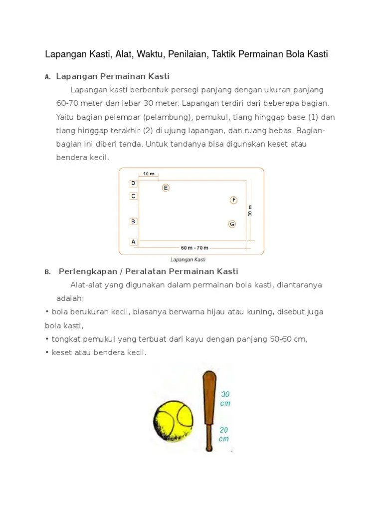 Menggambar lapangan bola kasti beserta ukurannya, cara menggambar lapangan bola kasti, cara menggambar lapangan bola kasti beserta ukurannya . Lapangan bola kasti berbentuk persegi panjang dengan ukuran panjang 60 meter dan memiliki lebar 30 meter. Ukuran lapangan bola kasti · panjang lapangan kasti: Ukuran lapangan bola kasti lengkap dengan gambarnya. Berikut ini adalah penjelasan mengenai ukuran lapangan kasti yang dikutip dari buku bermain kasti oleh .