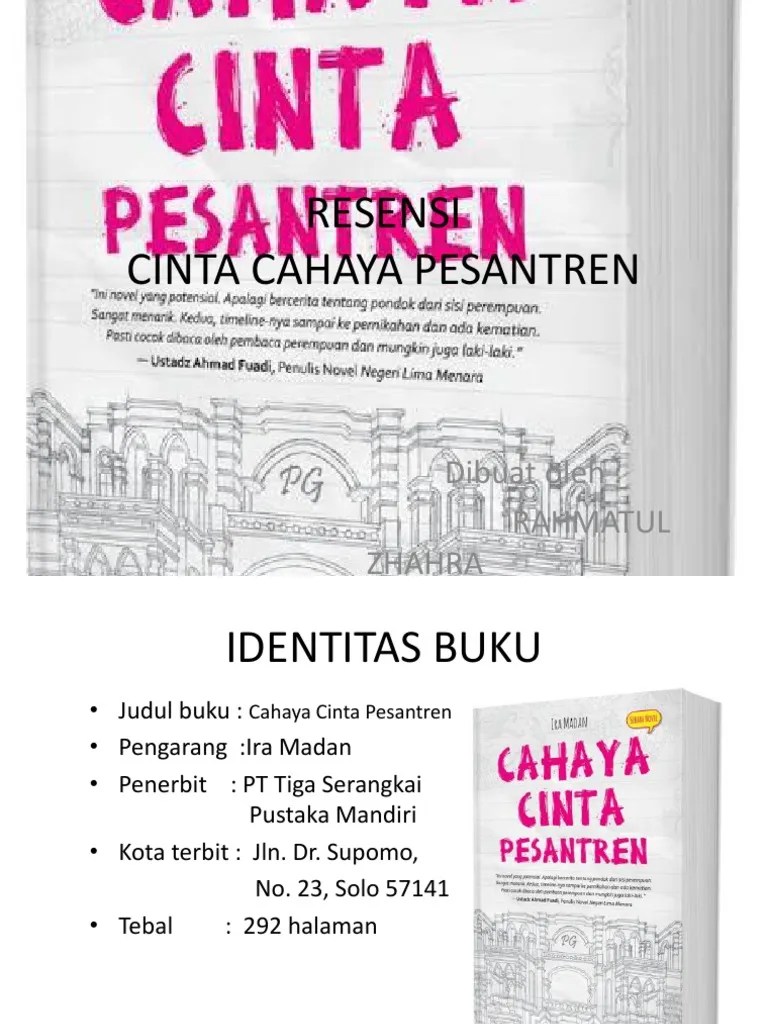 Novel negeri 5 menara karya ahmad fuadi dan novel cahaya cinta pesantren karya ira madan. Film ini diproduksi oleh fullframe pictures, mengadopsi dari novel best seller karya ira madan, film ini sangat ampuh sebagai berdakwah melalui media. Film cahaya cinta pesantren diangkat dari sebuah novel dengan judul cahaya cinta pesantren karya seorang penulis yang bernama ira madan. Film cahaya cinta pesantren adalah film produksi fullframe pictures yang diproduseri oleh ustadz h. Resensi novel cahaya cinta pesantren.